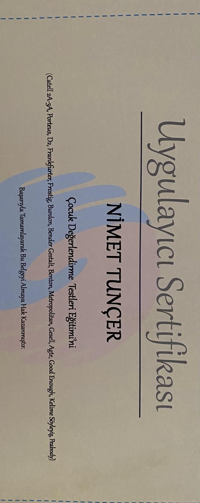Danışanlarına Ankara Gelişim Tarama Envanteri, D2 Dikkat Testi, Burdon Dikkat Testi, Frankfurter Dikkat Testi, Catell 2A Zeka Testi, Catell 3A Zeka Testi, Gessel Gelişim Figürleri Testi, Good Enough Harris (Bir İnsan Çiz) Testi, Peabody Resim Kelime Eşleştirme Testi, Metropolitan Okul Olgunluğu Testi, Frostig Gelişimsel Görsel Algı Testi, Benton Görsel Bellek Testi, Porteus Labirentleri Testi, Bender Gestalt Görsel Motor Algılama Testi ve Denver II Gelişim Tarama Envanteri uzman uygulayıcısıdır.