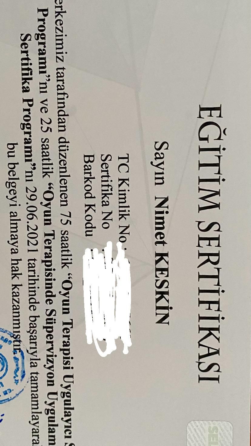 Bunlar ile birlikte Selçuk üniversitesi oyun terapisi eğitimini tamamlayarak oyun terapisti ünvanını almıştır.